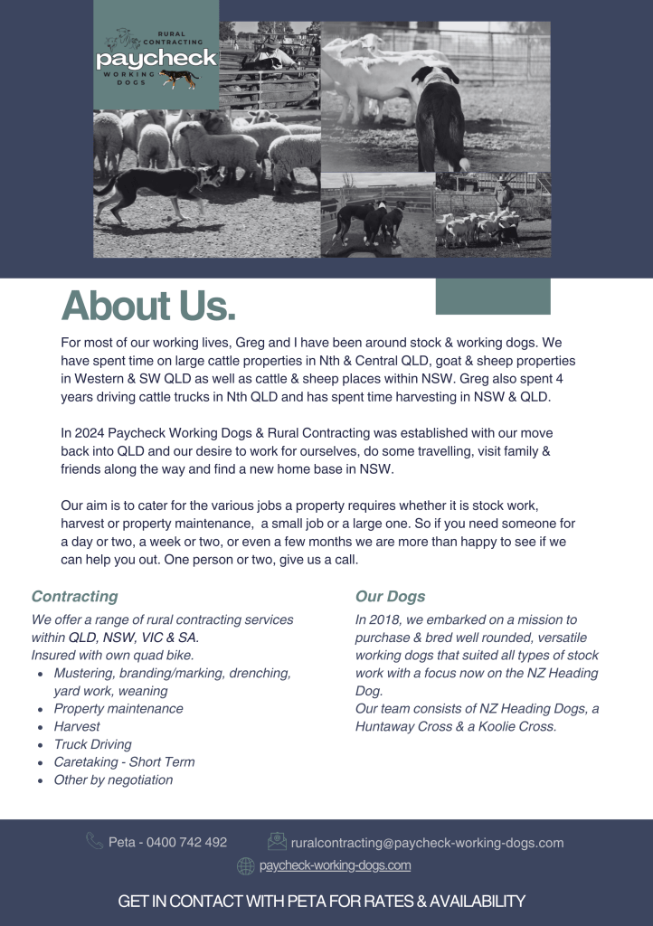 We have over 25 years experience in the Agriculture Industry, working on cattle, sheep & goat properties. Greg spent over 4years carting cattle in Nth Qld. We come with our own bike & team of working dogs. Whether you need 1 person or a team of 2 we have you covered.